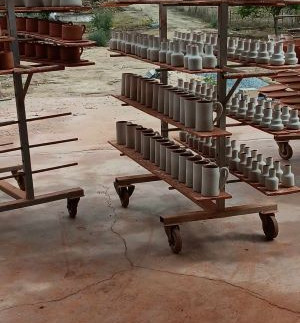 Primeiro é preparar o barro, fazer a peça, secar, depois leva um banho com barro branco líquido para pintar, enfornar, desenfornar, vidrar, enfornar novamente, desenfornar, e vendê-las depois.